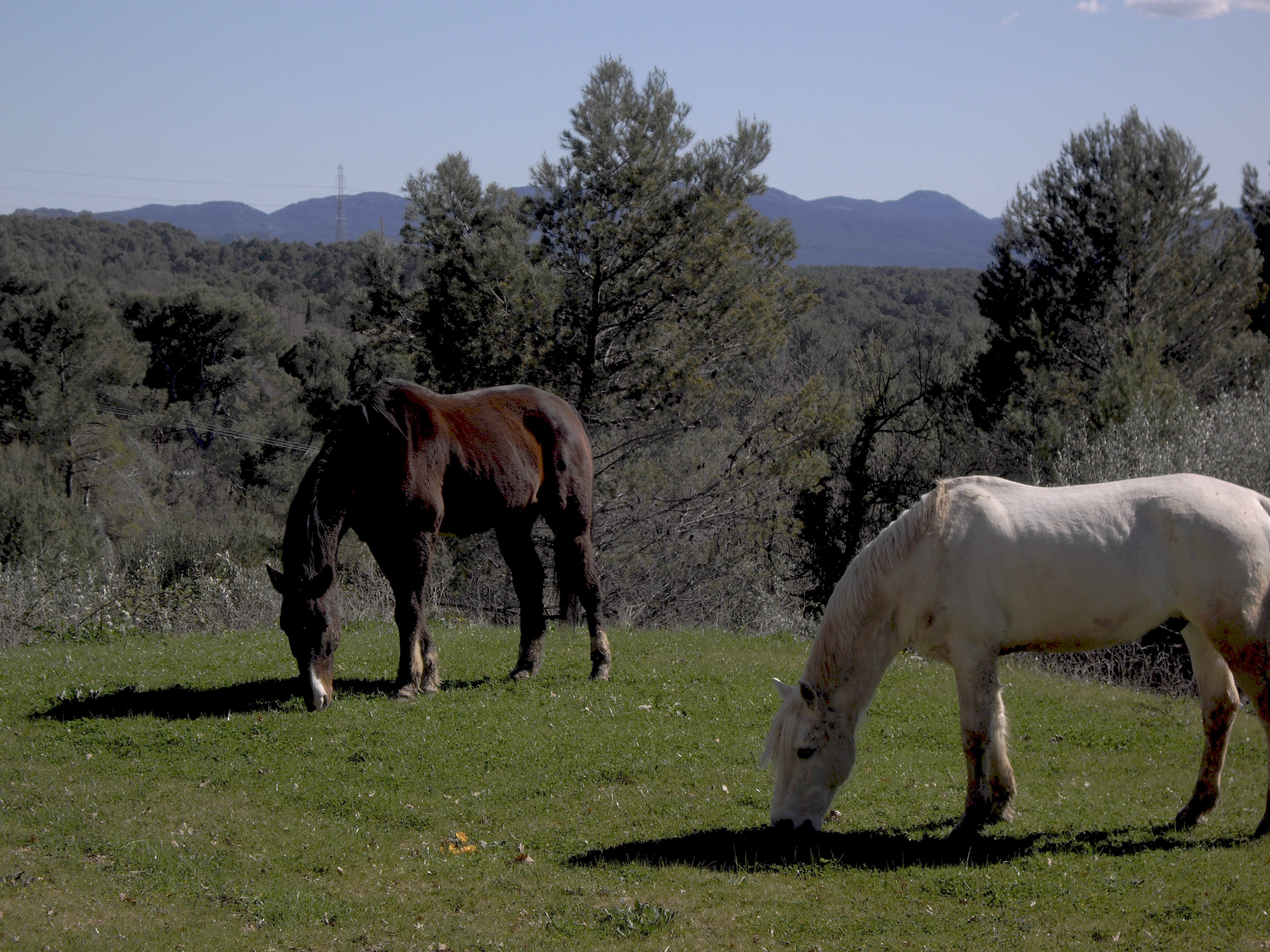 Prairie : Grand espace d’herbe à proximité du paddock avec deux chevaux. Jeux d’extérieur pour enfants